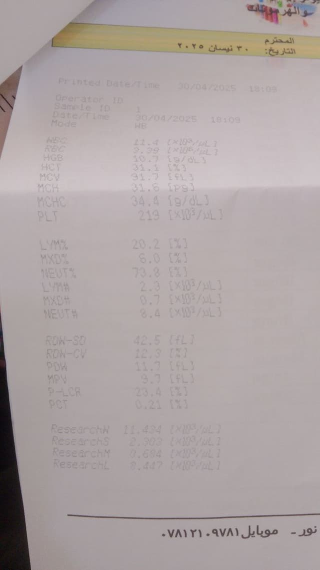 وصف المنتج: هذه ورقة طبية مطبوعة تحتوي على نتائج اختبار تعداد الدم الكامل (CBC)، وتعد من أكثر التحاليل المشخصة.....اضغط لعرض الوصف كامل